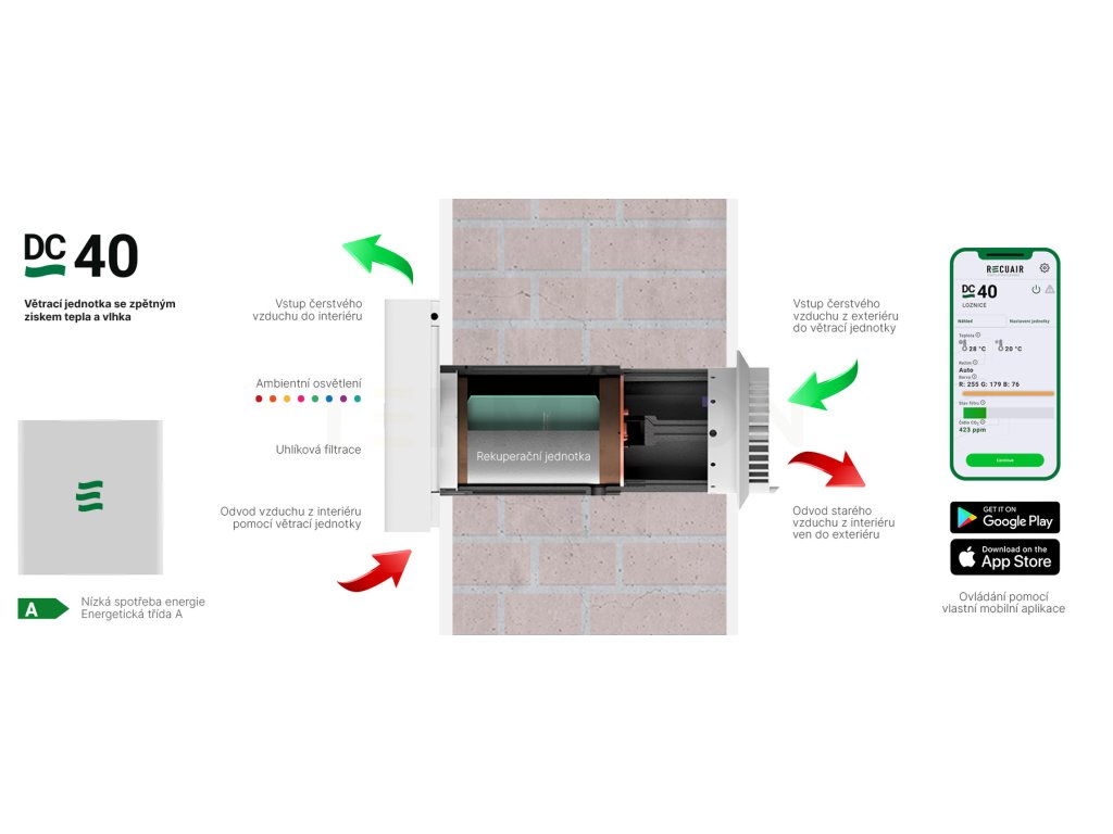 - Zpětný zisk tepla a vlhkosti (~40 % vlhkosti)