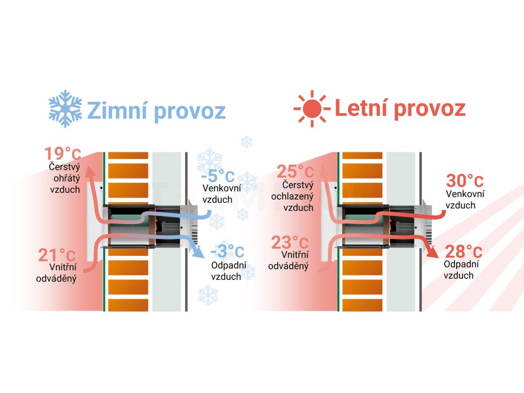 Rekuperační jednotka s entalpickým výměníkem (ERV) skutečně navrací část vlhkosti zpět do prostoru, čímž optimalizuje vnitřní klima – ideální pro suchý vzduch v ložnicích, dětských pokojích, kancelářích nebo prodejnách.