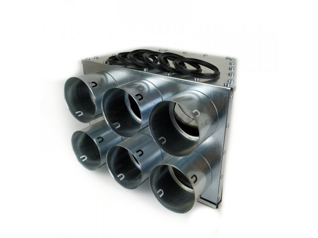 Celokovový rozdělovací box pro rekuperační systémy. Provedení: 6x90/160 – dvouřadý kónický. Rozdělovač je protihlukově izolován.
